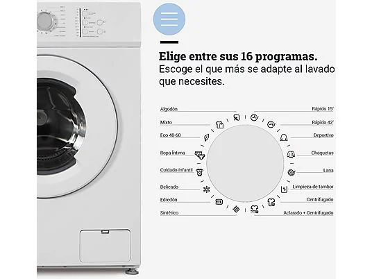 ¡Que no te pille el toro! Con su lavado rápido de 15 minutos, podrás tener todo listo ante cualquier imprevisto, o deshacerte de toda la suciedad con su lavado a altas temperaturas . Cubre todas tus necesidades y elige entre sus 16 programas de lavado :